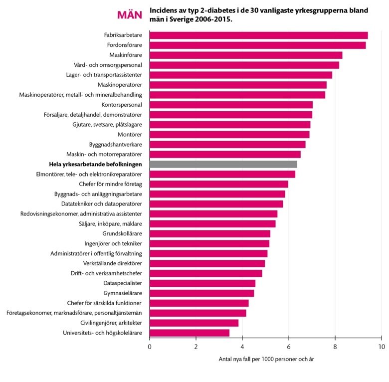 Oversikten viser at yrker som fabrikksarbeidere, yrkessjåfører samt omsorgsyrker har høyest risiko for diabetes, mens sivilingeniører, arkitekter og forelesere på universitet og høyskole har lav risiko.