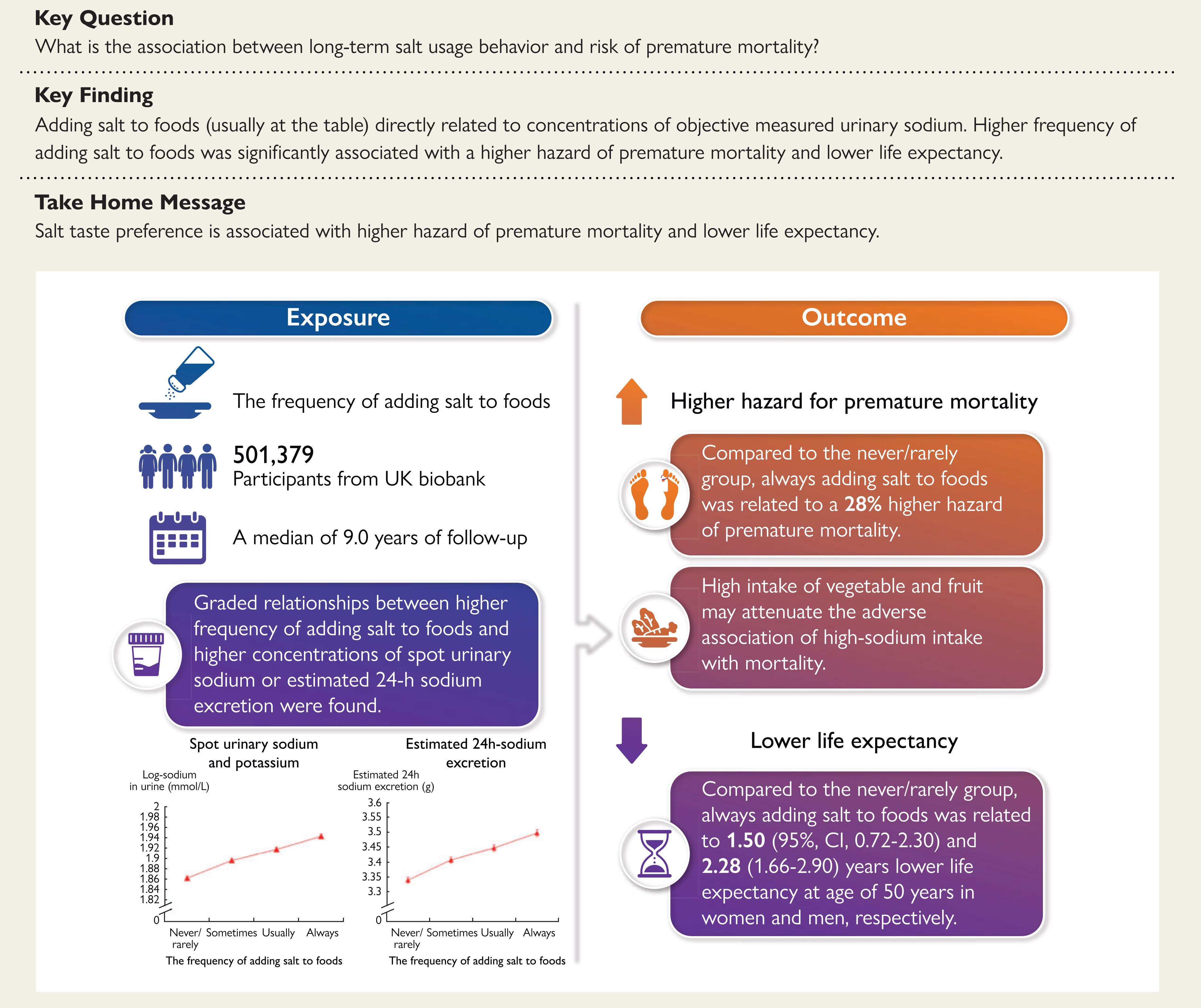 Sammenlignet med mennesker som sjelden eller aldri tilsetter salt, har mennesker som alltid tilsetter salt en 28 prosent høyere risiko for en tidlig død – uansett dødsårsak. Studien anslår forventet levealder for mennesker som alltid salter maten til å være ca. 1,5 år lavere for kvinner og 2,28 år lavere for menn, sammenlignet med de som sjelden eller aldri salter maten.