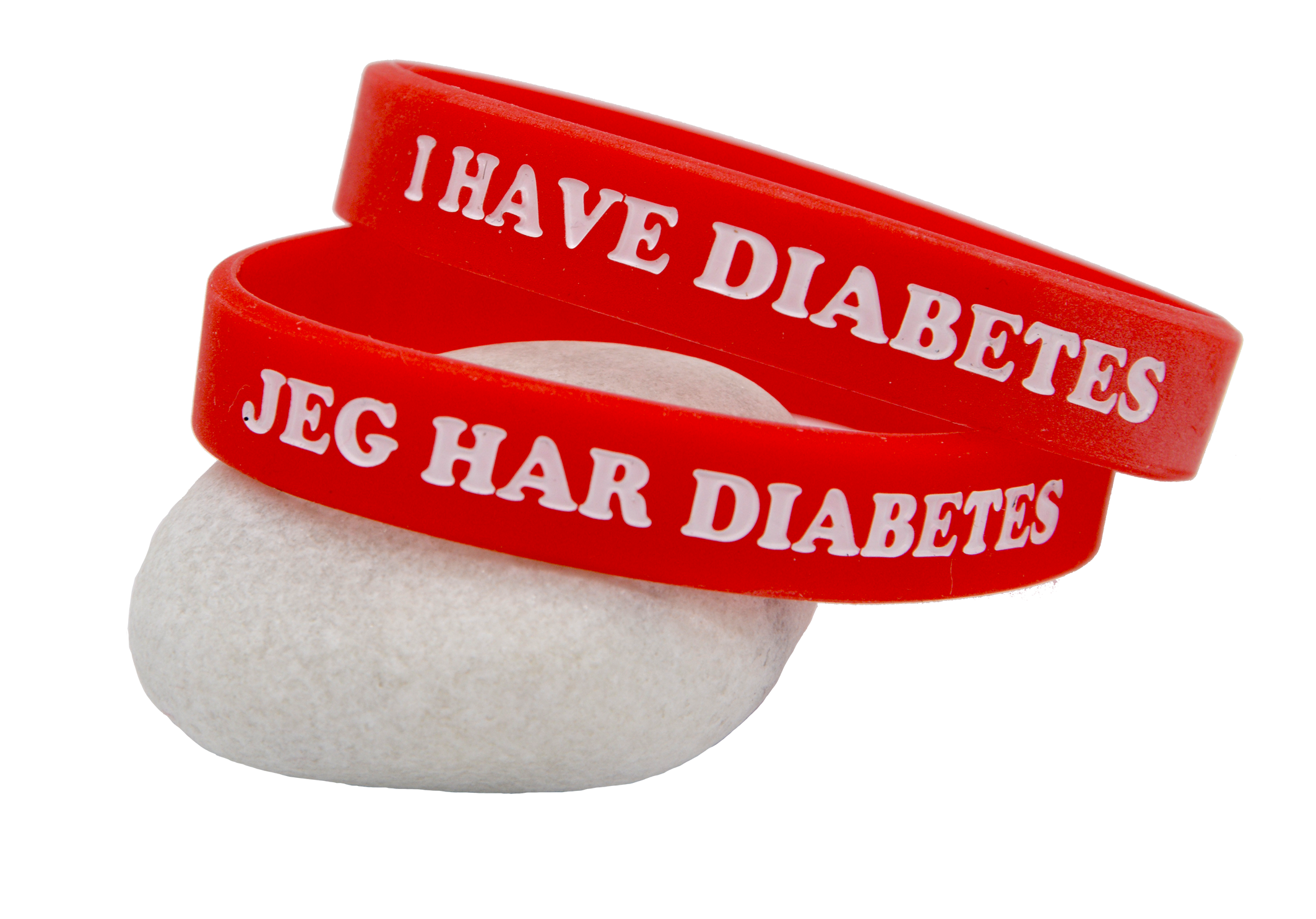 Ved å henvende deg til oss, kan du få disse armbåndene gratis tilsendt. Diabetesarmbåndene er produsert i gummi og passer godt når du er på reise eller som et tillegg til halskjedet. Teksten er preget på både norsk og engelsk, og teksten informerer om at du har diabetes.